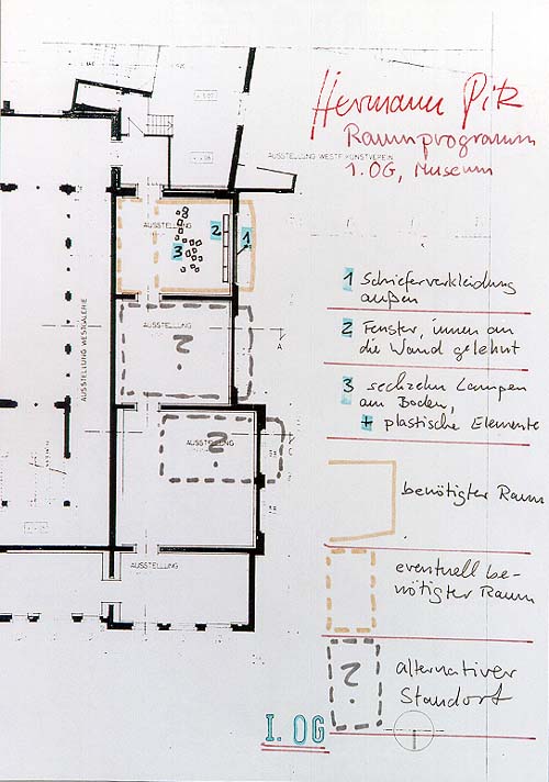 Hermann Pitz: Geplante Installation im 1. Obergeschoß des Museums, 1996, Grundriß mit Eintragungen, Filzstift, 21x29,7 cm